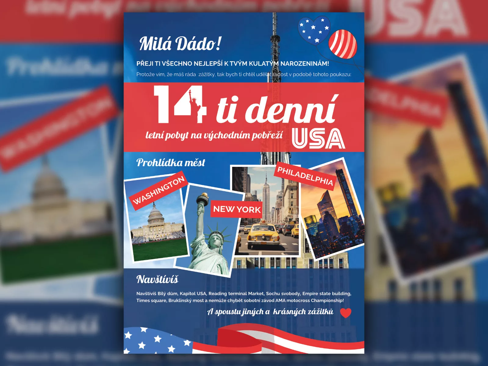 Grafika narozeninového voucheru na cestu do USA. 🙂